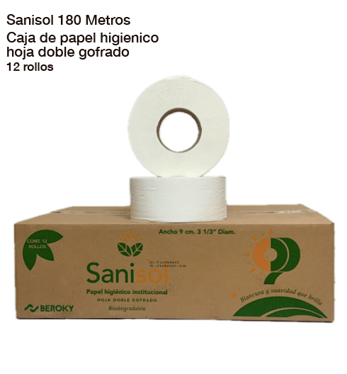 Rollo de papel higiénico blanco / Sanisol de 180 metros / Hoja doble gofrado